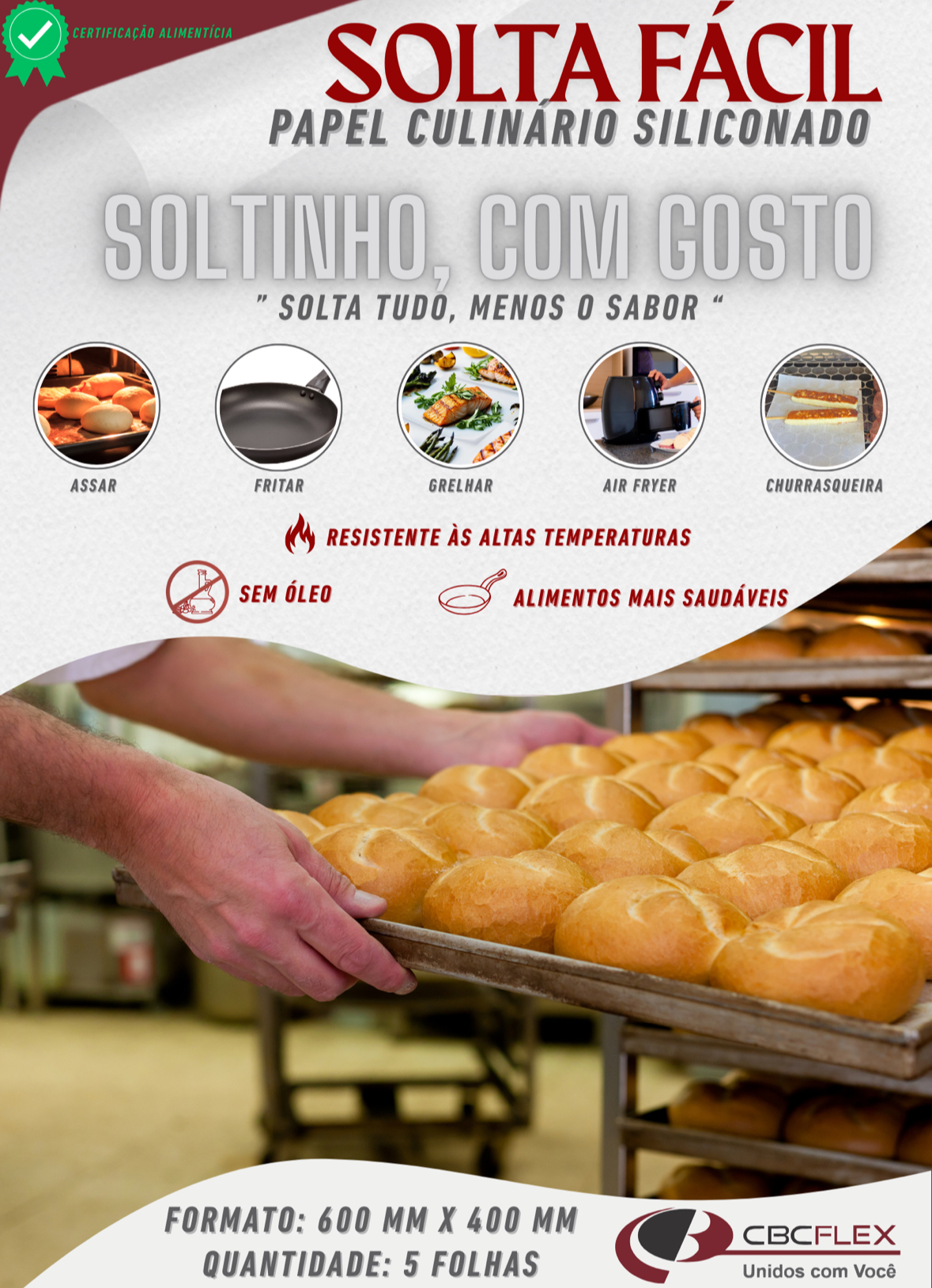 O Papel SOLTA FÁCIL é o aliado ideal para quem busca praticidade, limpeza e alimentos mais saudáveis no preparo de receitas assadas. Com uma camada antiaderente de silicone, ele dispensa o uso de manteiga ou óleo para untar, evita que os alimentos grudem e suporta temperaturas de até 280°C, sendo perfeito para fornos, grelhas e até churrasqueiras.